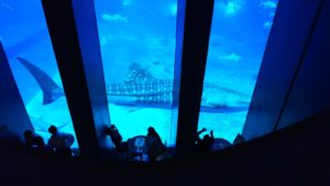 巨大水槽に、巨大ジンベイザメが2匹ぐるぐる遊泳している。感動です。