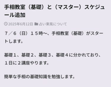 7/6(日)15時~、手相教室(基礎)がスタートします。 基礎1、基礎2、基礎3、基礎4に分かれており、1日に2講座やります。 簡単な手相の基礎知識を勉強します。 簡単な(遊び感覚で)手相診断も出来るようになるでしょう。 詳しいスケジュールはこちらから 7/20(日)15~、手相教室(マスター)がスタートします。 マスター1 ~ 12まであり、1日に2講座やります。 隔週の日曜日開催 […]