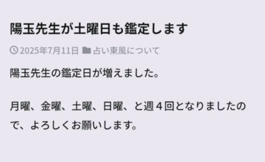11月14日(月)から、新しいメンバー『陽玉先生』が鑑定に加わりました。 巫弥香先生の部屋で鑑定しています。 東風よりも占い師歴が長く、鑑定件数も多いので、安心してお願いしております。 東風、巫弥香先生と同じ様に、お客様の気持ちに寄り添って占える先生です。 占いに使う占術が、東風、巫弥香先生とは違いますから、僕らとは違う視点から占ってもらえますから、三者三様の良さがあります。 お客様と占い師の相性 […]